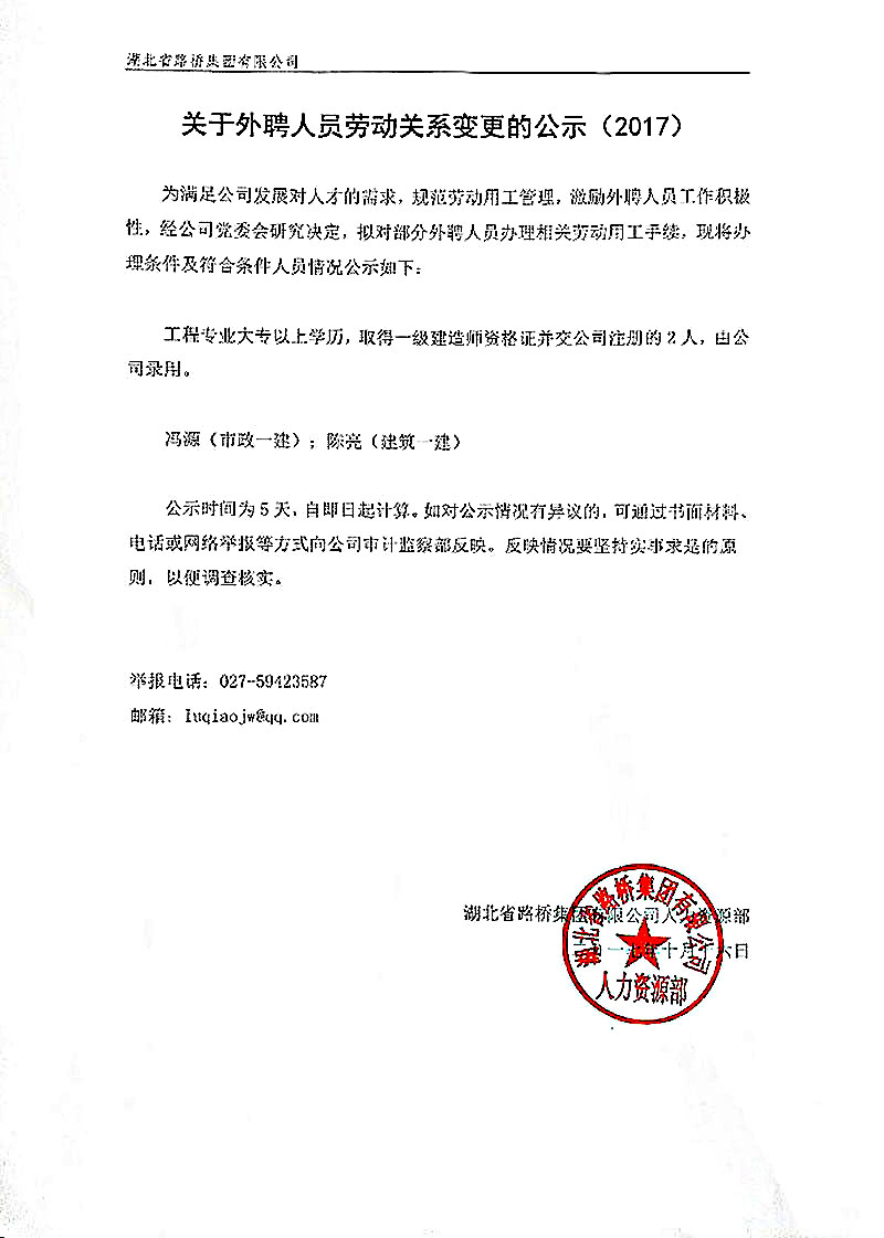 关于外聘人员劳动关系变更的公示(2017)